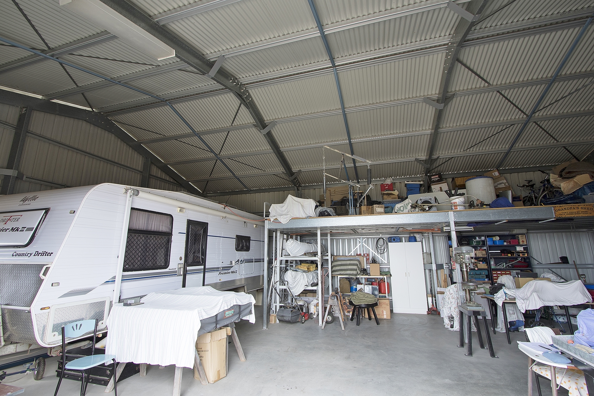• 12 x 9 m  shed - with mezzanine floor, 3 phase power and extra high bay for caravan