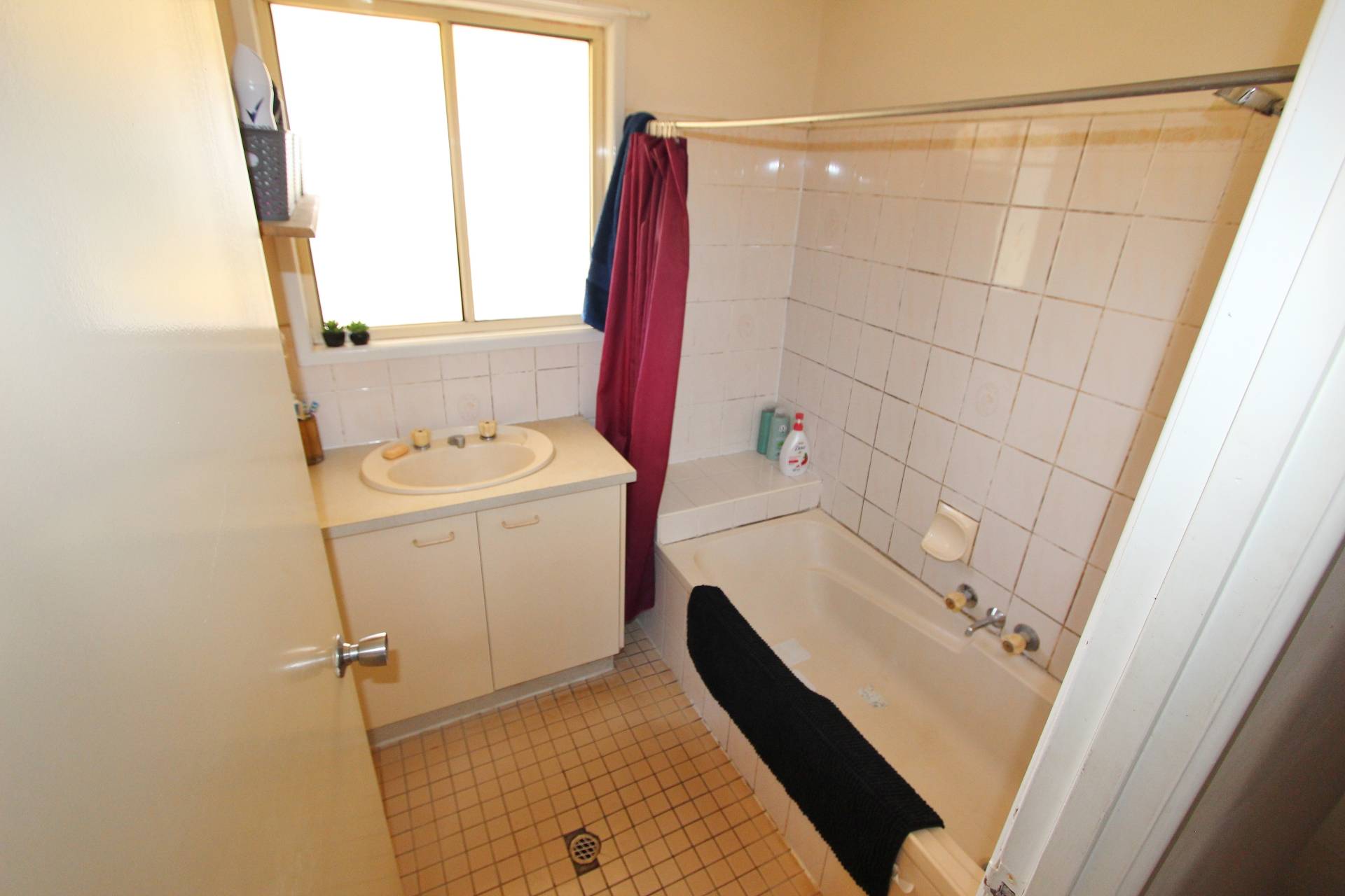 • Tiled bathroom with shower over bath
