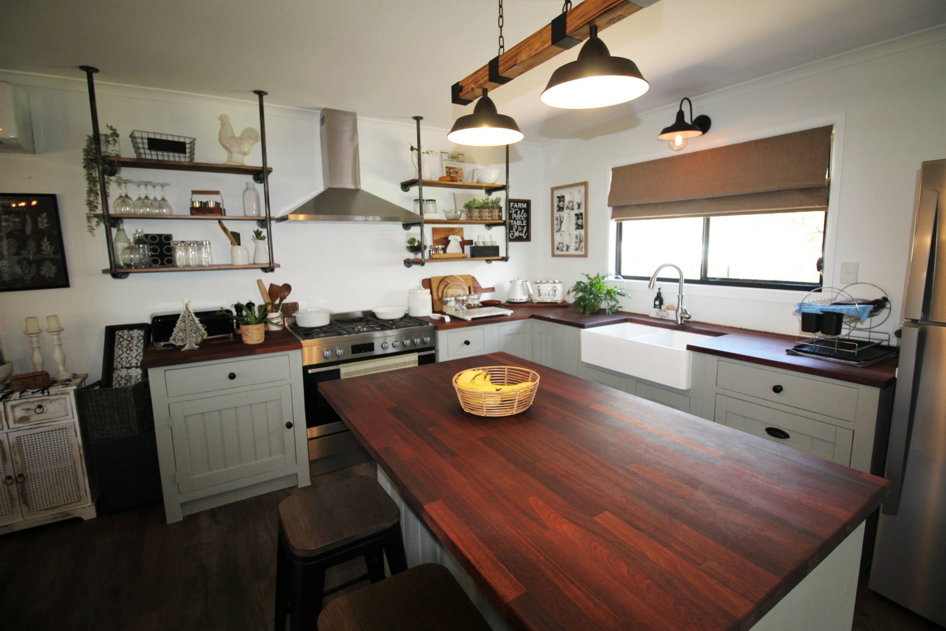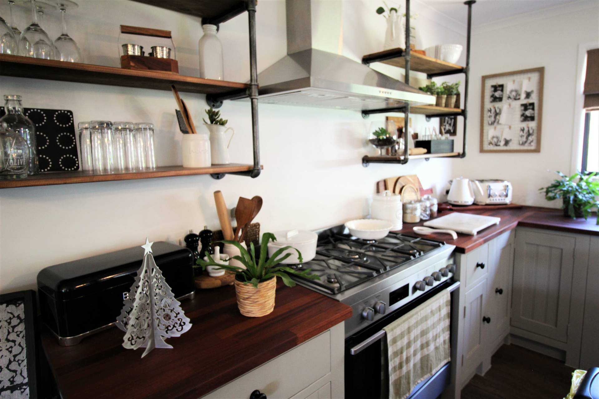 • Kitchen with island bench and 5 burner gas cooktop with electric oven