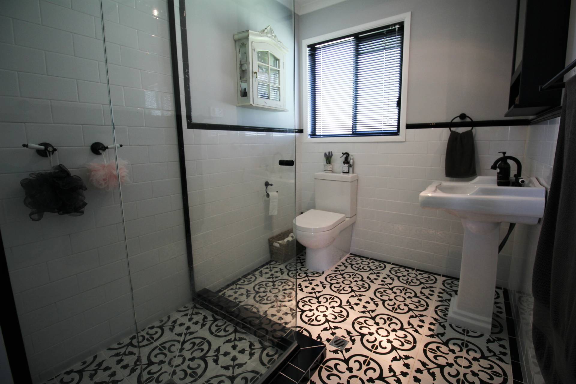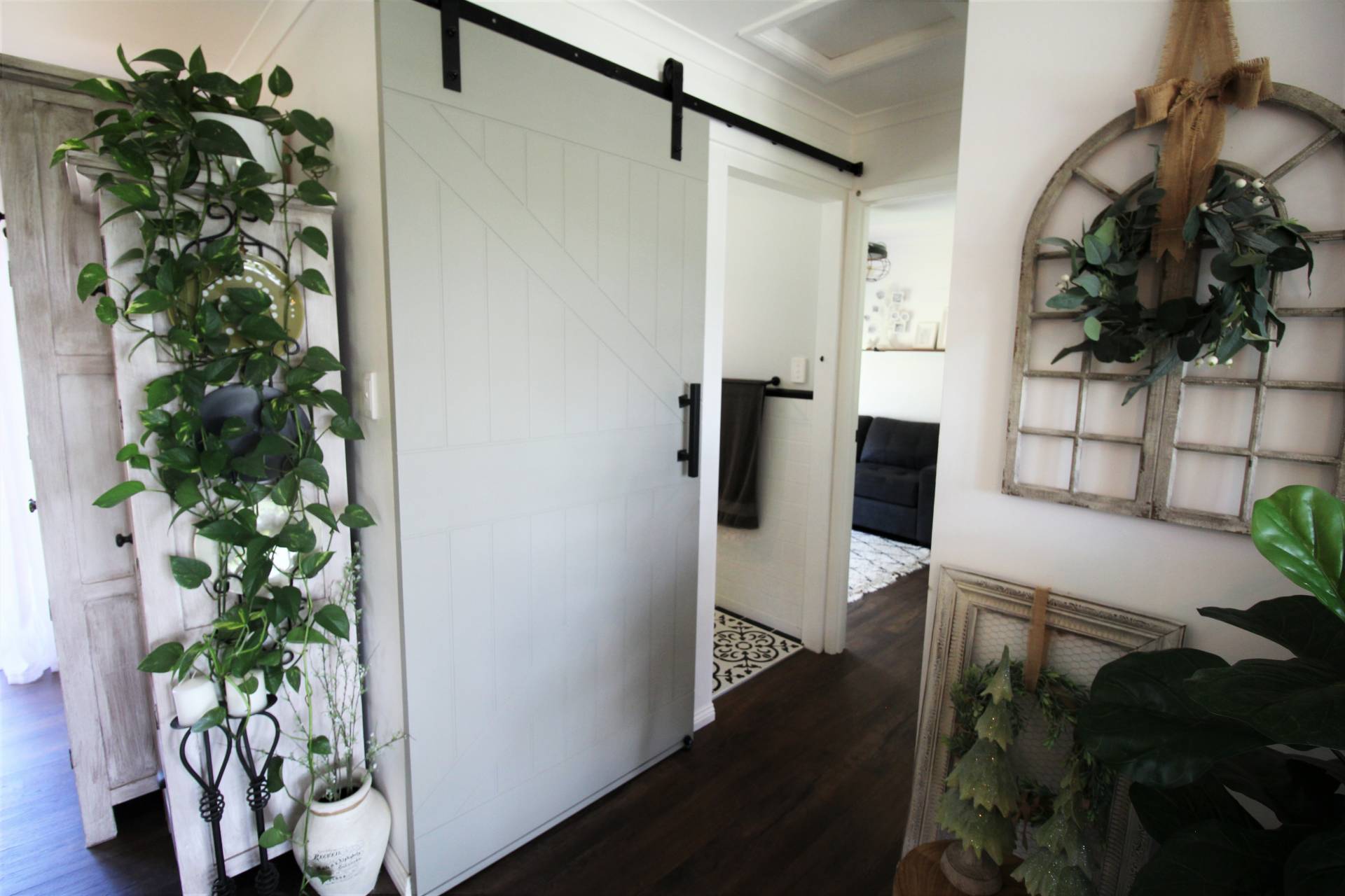 • Modern combined bathroom with barn door