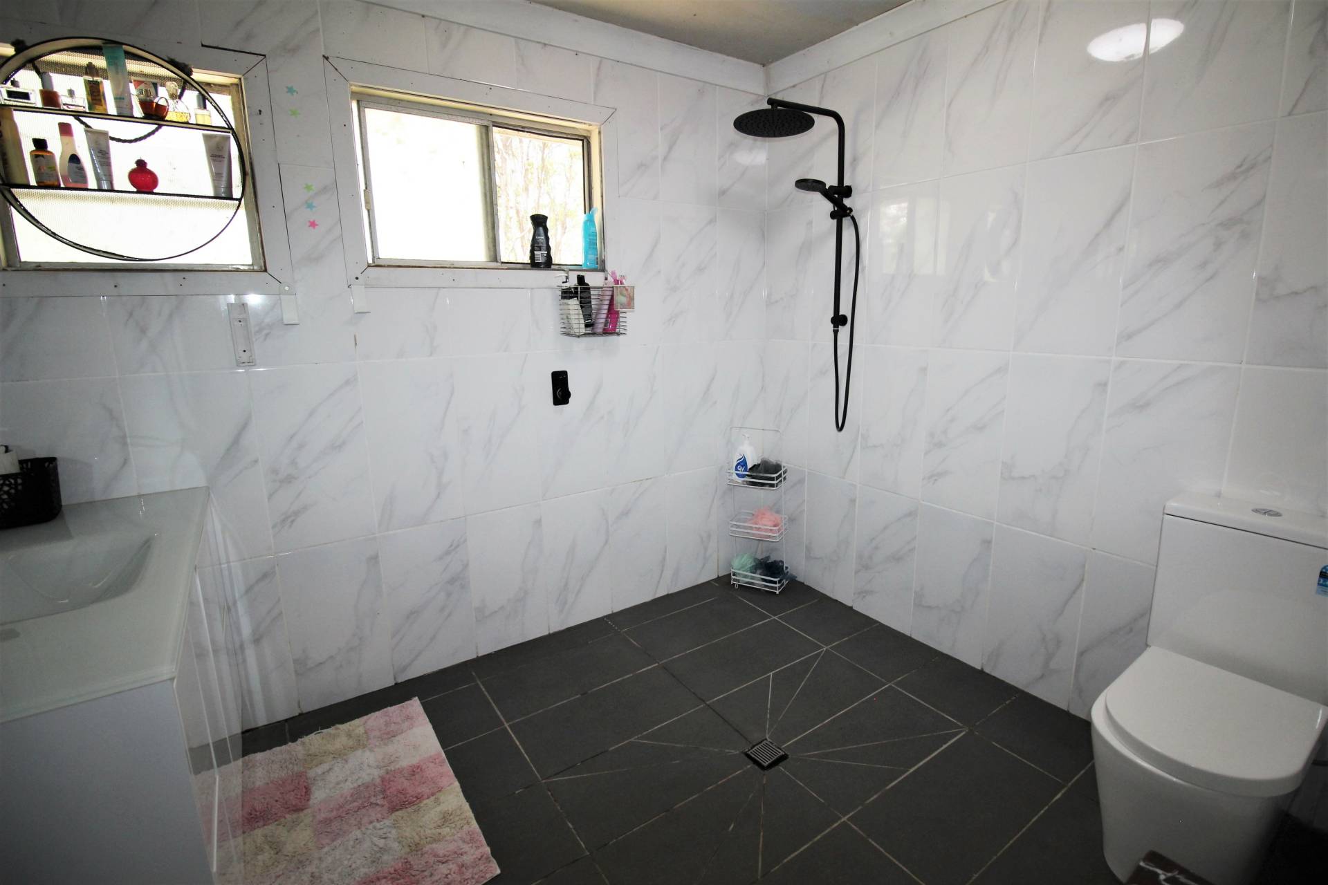 • Modern tiled bathroom with open shower & combined toilet