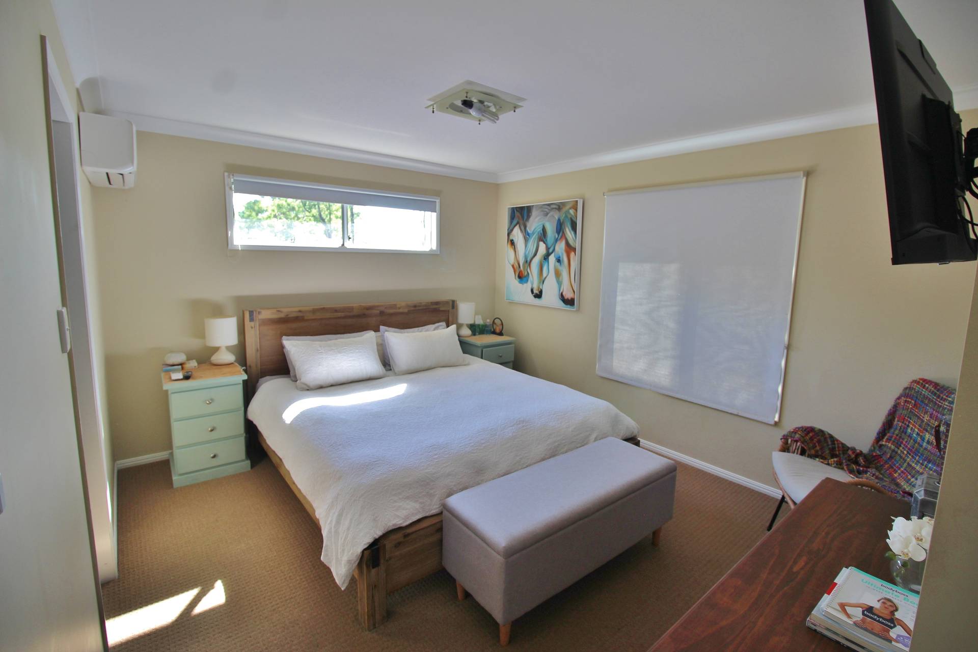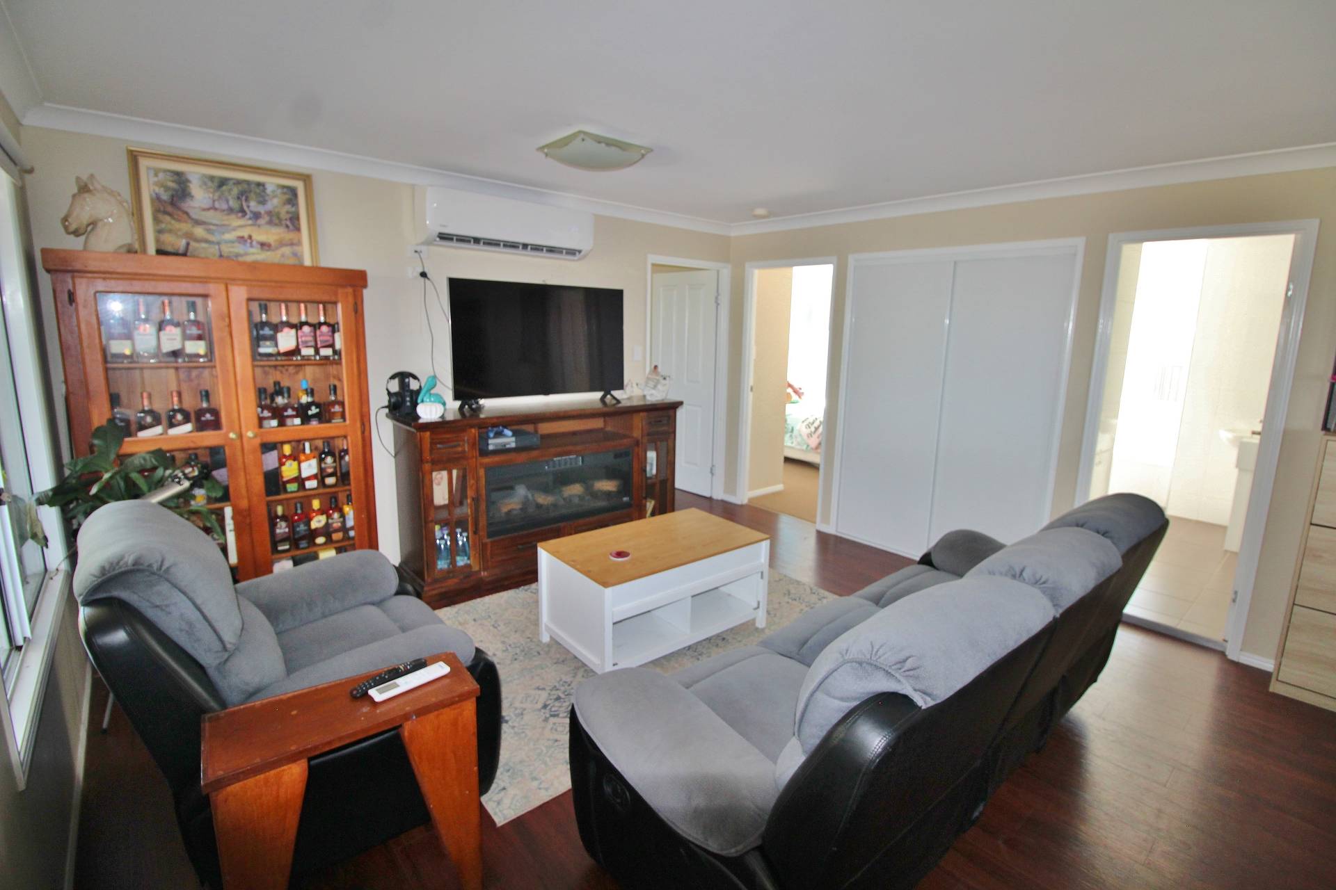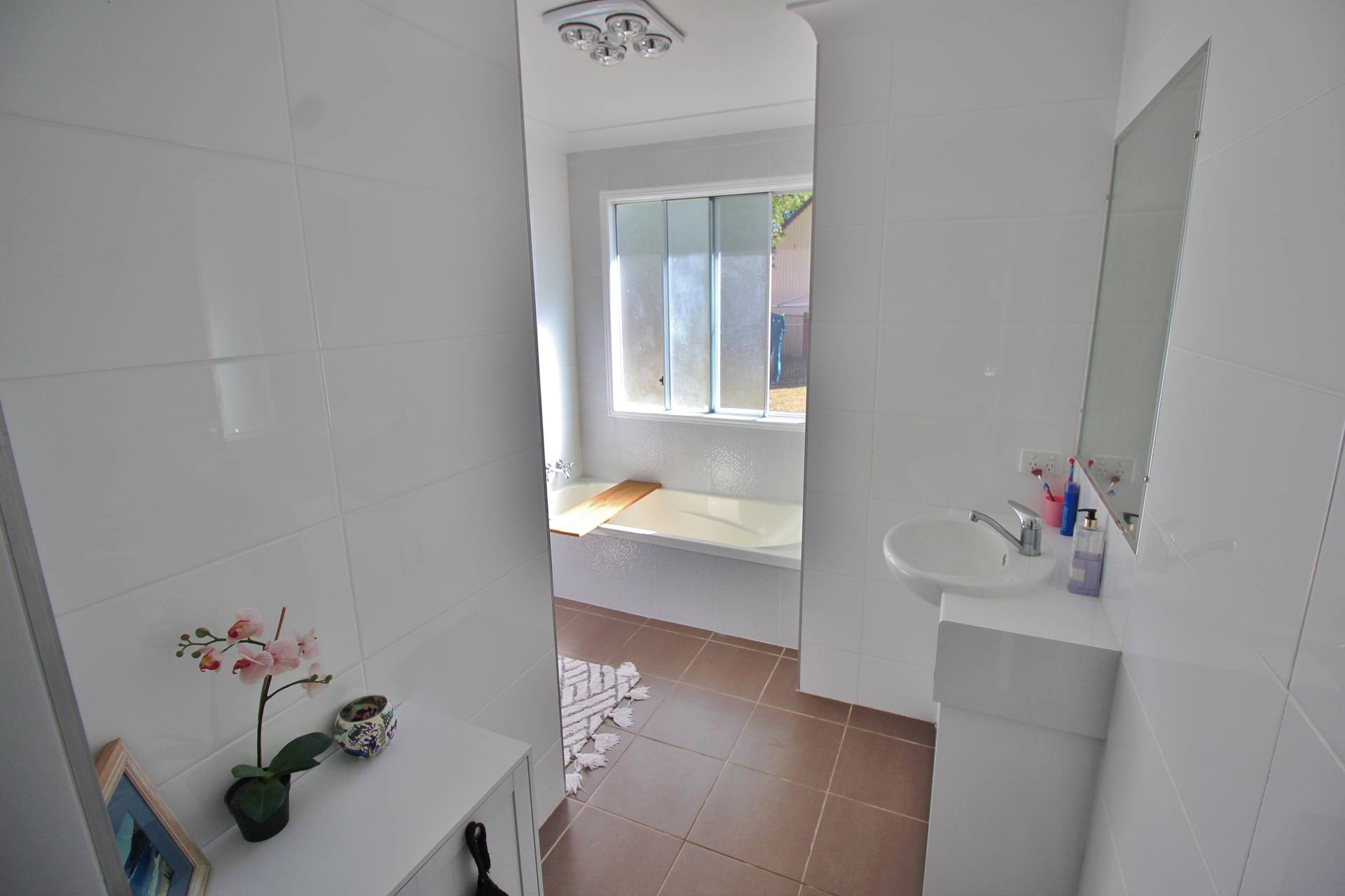The stylish main bathroom is designed for convenience, with a walk-in shower, bathtub, and separate toilet. Additional features include a large laundry with built-in storage and 4 split-system air conditioners throughout for year-round comfort.