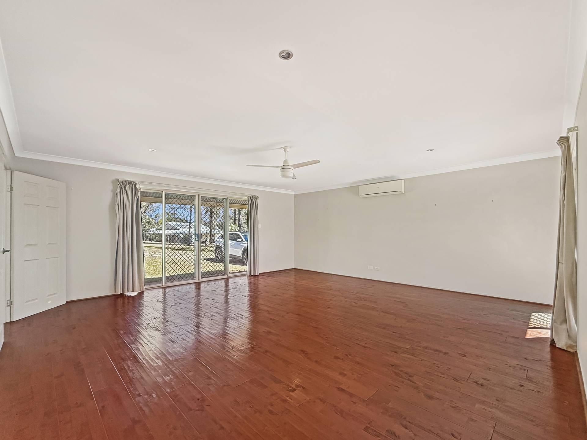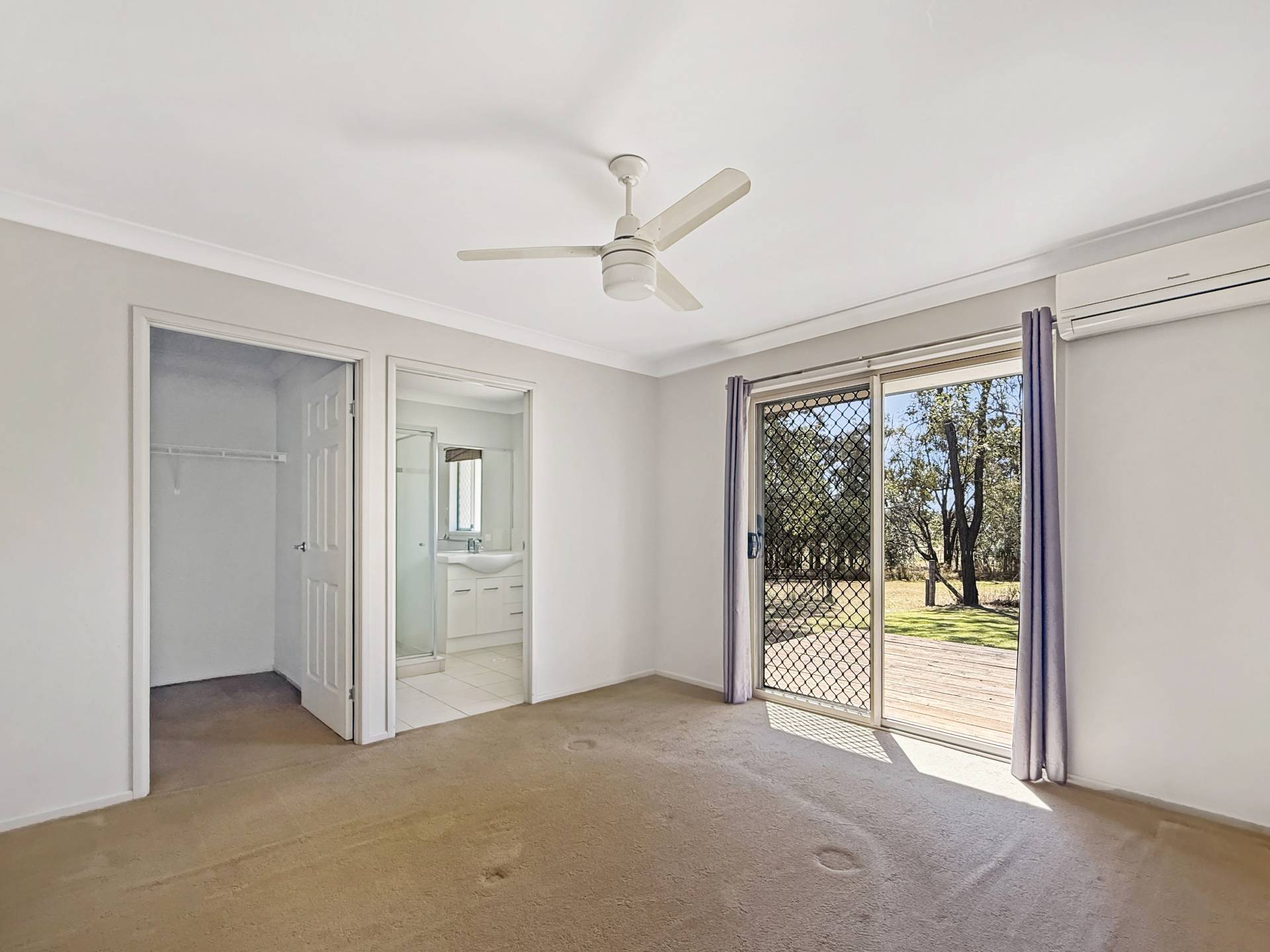 The master suite includes a walk-in robe, ensuite, air conditioning, and ceiling fan, while the remaining three bedrooms are fitted with ceiling fans and serviced by a spacious family bathroom.