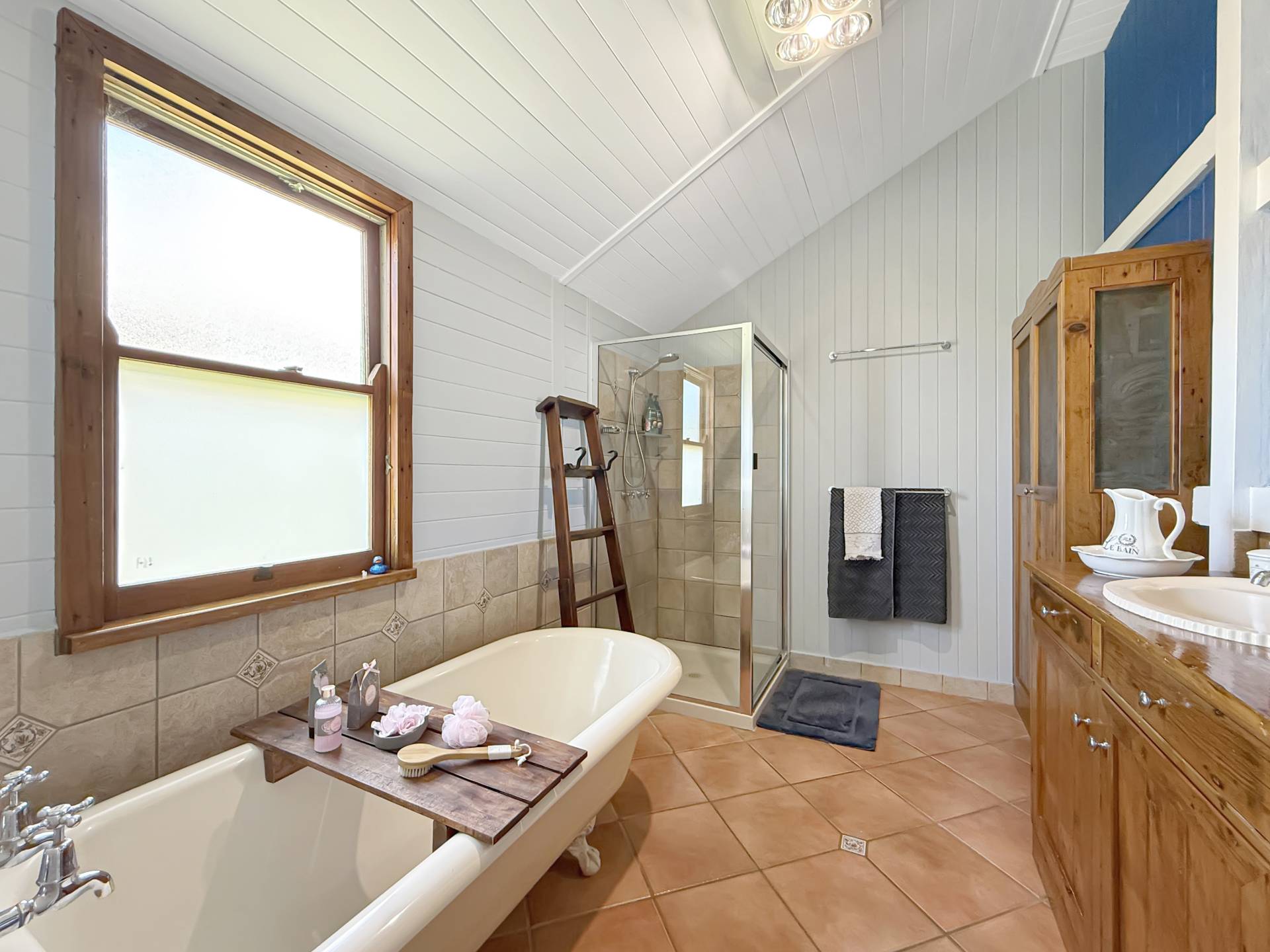 • Stunning family bathroom featuring a claw-foot bathtub and stylish timber surrounds