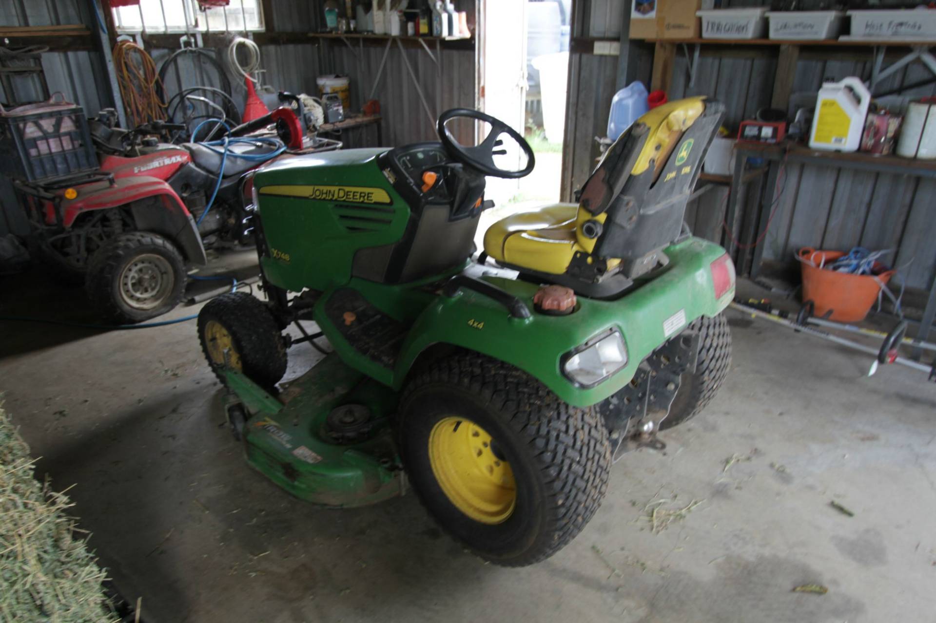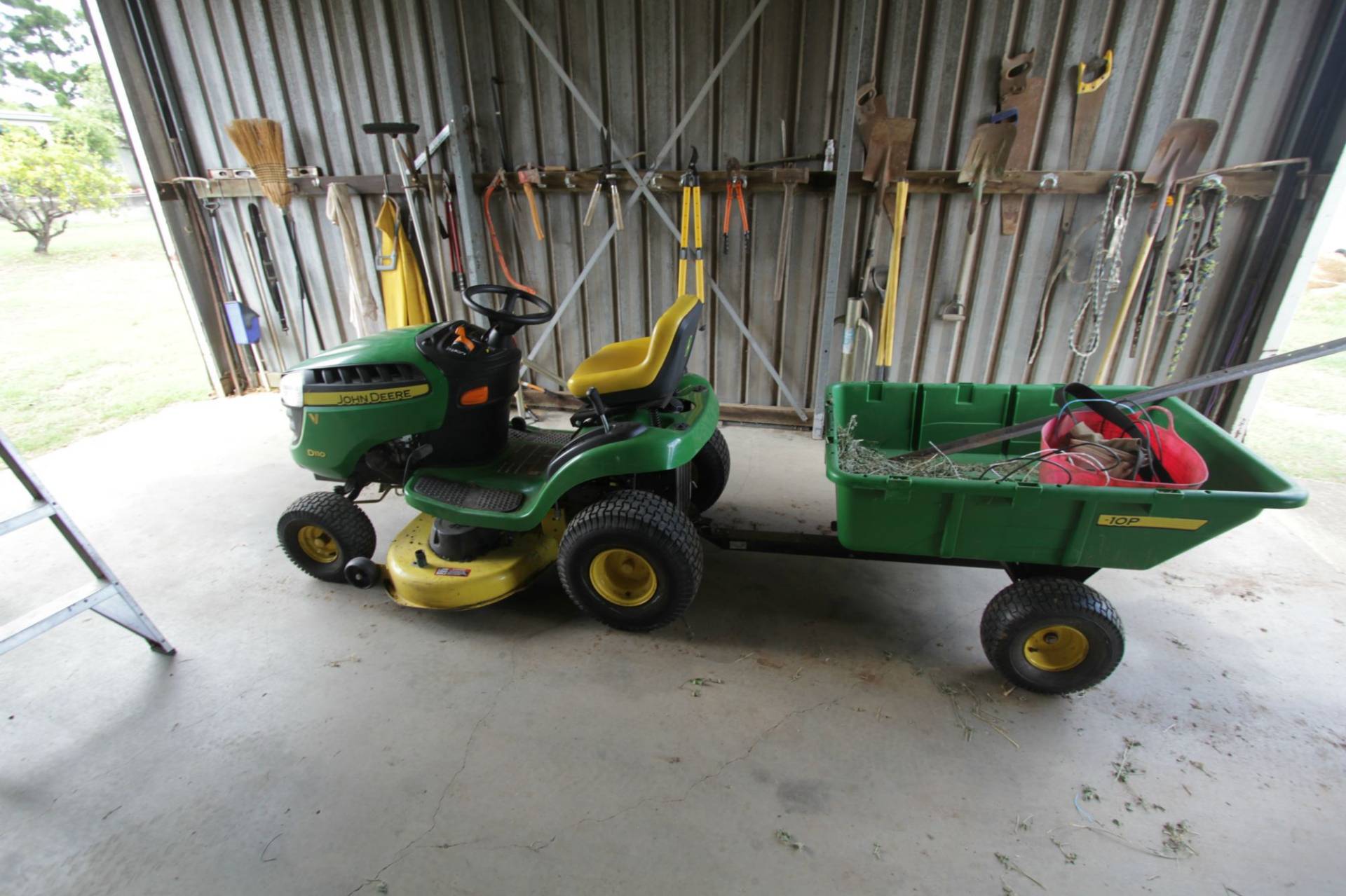INCLUDED MACHINERY: John Deere x748 Large Ride on Mower, John Deere d110 Ride on New with Trailer, Horse Manure Paddock Pick-up Vacuum, Chain Saw, Weed Eater and Assorted Tools.