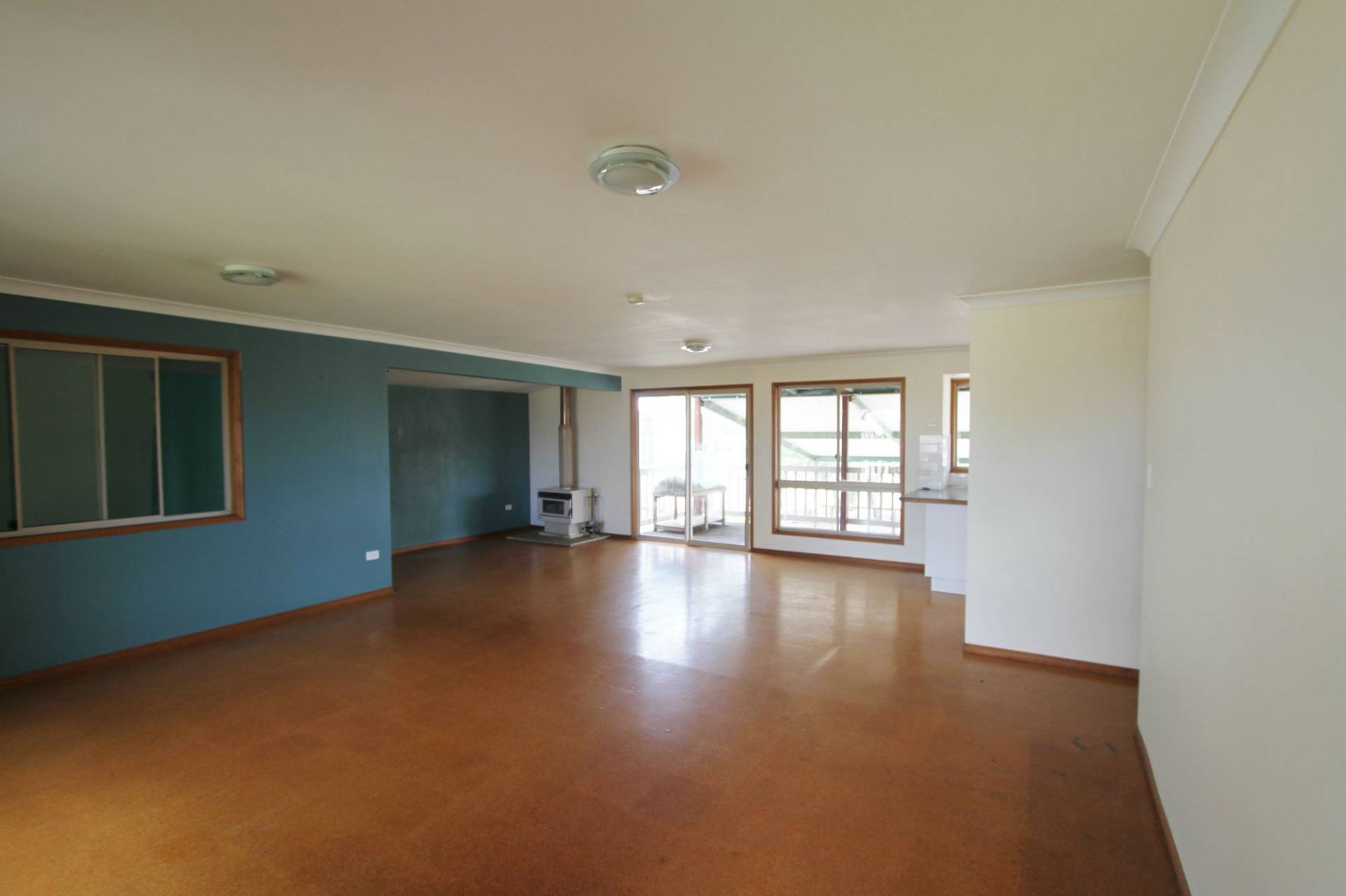 - Large open plan living area with wood heater